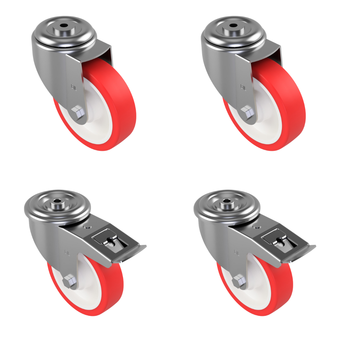 Boost the mobility of your heavy-duty trolley or any other equipment with the 4 Pack 150mm Polyurethane Nylon Bolt Castor Wheels. Combining stability and smooth movements, these castor wheels are designed for heavy-duty support. The high-quality castor set includes 2 swivel castors and 2 swivels with total lock brake castors for added stability.The swivel castors provide 360⁰ manoeuvrability and effortless movement for direction changes. The swivel castor wheels are perfect for tight spaces, letting you easily navigate around obstacles or corners. The wheels with total lock brakes help keep the trolley secure and stable when you wish to stop.