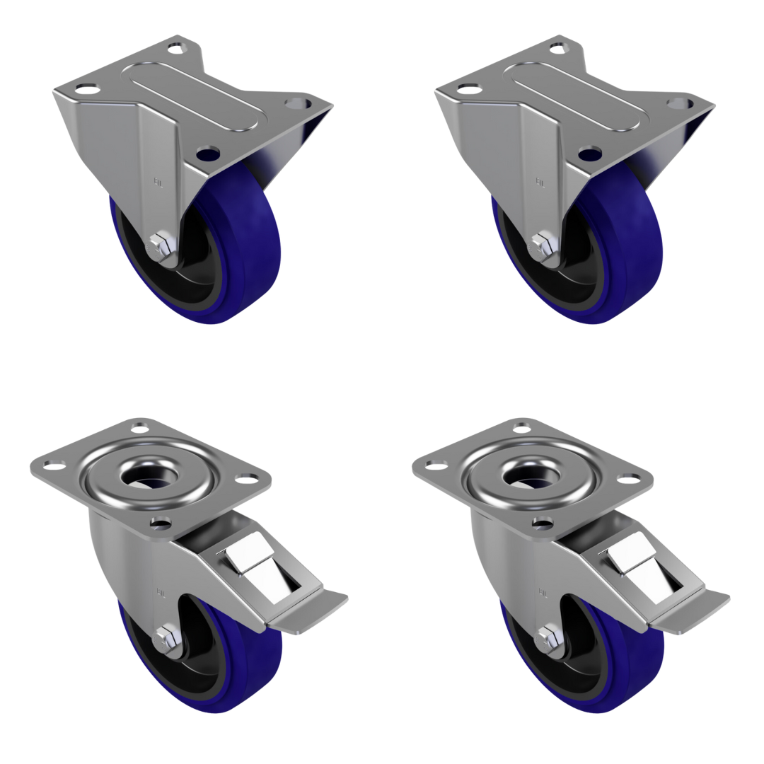 100mm Blue Elastic Rubber Bolt Hole Castor Wheels Pack (2 Swivel, 2 Braked) – 480kg Load Capacity