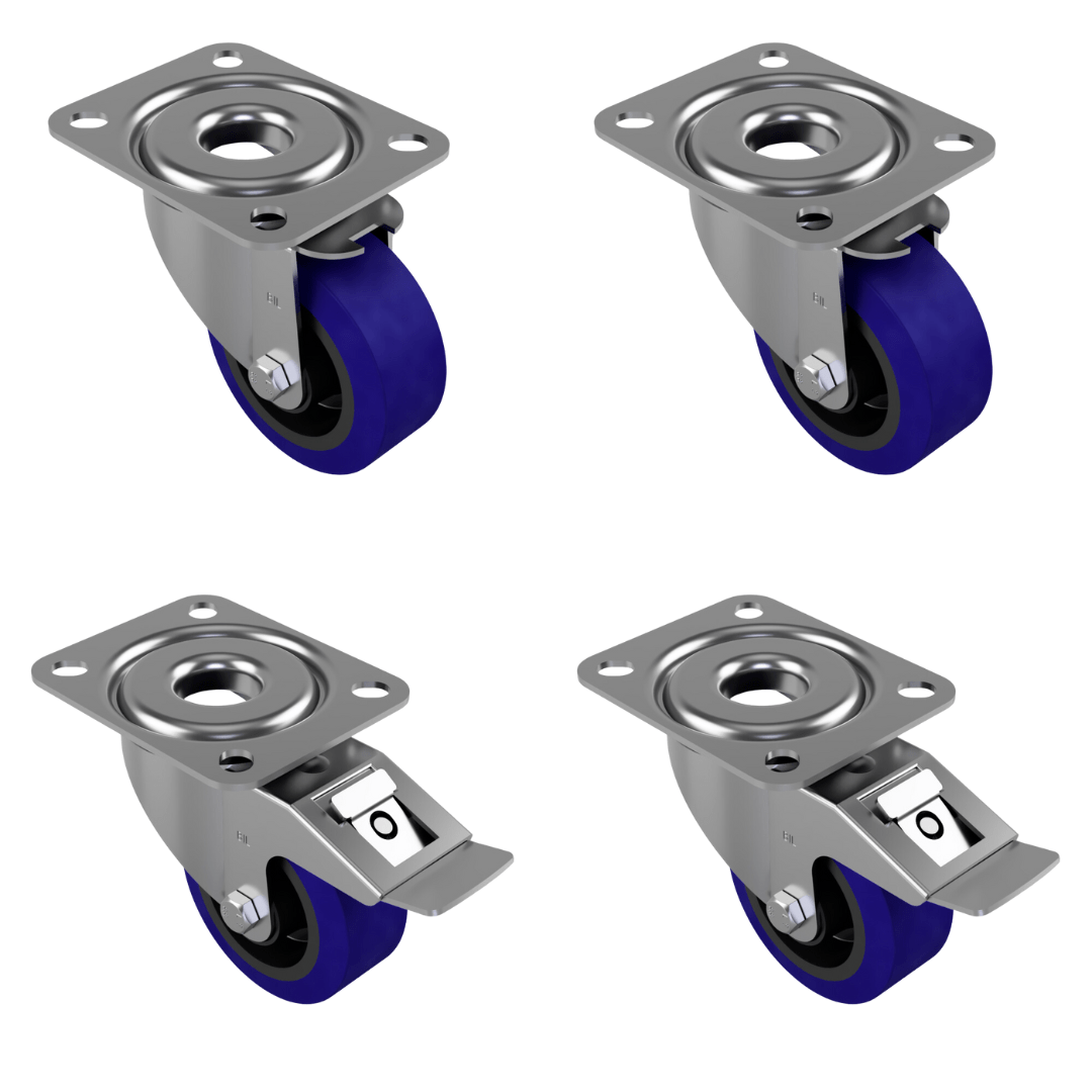 80mm Blue Elastic Rubber Bolt Hole Castor Wheels Pack (2 Swivel, 2 Braked) – 450kg Load Capacity